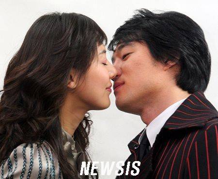 23일 오후 일산 탄현 SBS제작센터에서 열린 주말극장 '하늘이시여'의 제작현장공개에서 주연배우 이태곤과 윤정희가 입맞춤 연기를 하고 있다. /이동훈기자 photoguy@newsis.com <관련기사 있음>