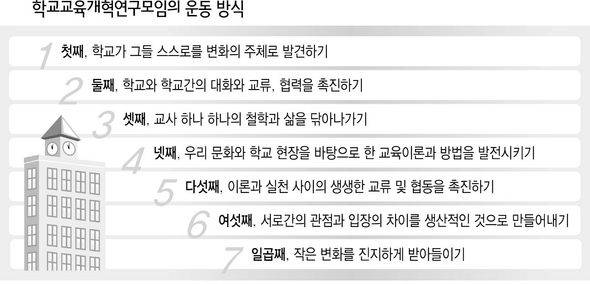 학교교육의 아름다운 변화를 꿈꾸는 대학 교수, 제도권학교 및 대안학교 교장과 교사들의 모임인 '학교교육개혁연구모임'의 슬로건이다. 이 모임이 벌이는 운동의 '지향'을 잘 보여준다. 이 모임은 거창한 이념이 아니라 소박한 실천을 소중하게 여긴다. 학교교육 개혁의 실마리를 학교 '밖'이 아니라 '안'에서, '제도'가 아니라 '정신'에서 찾고자 한다. 1997년 시작된 러시아의 '아름다운 학교 운동'과 맥을 같이 한다. 이 모임은 2002년부터 해마다 한 차례씩 한자리에 모여 서로의 실천 사례와 그 속에 담긴 정신을 나눠 왔다. 이 모임의 다섯번째 행사가 4~7일 전남 순천 순천대에서 열렸다. 올해의 주제는 '학교를 단위로 한 변화란 무엇인가?'였다. '교육혼', '아름다움', '생태적 학습'을 지향점으로 내걸었다. 4일 동안 이 세 가지 지향을 담은 다양한 단위 학교의 실천 사례 발표와 강연이 이뤄졌다.