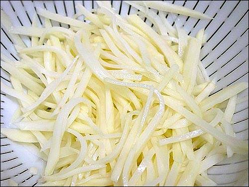 | ▲ 채 썬 감자를 물에 담가 전분기를 빼고 체에 건져두세요. |