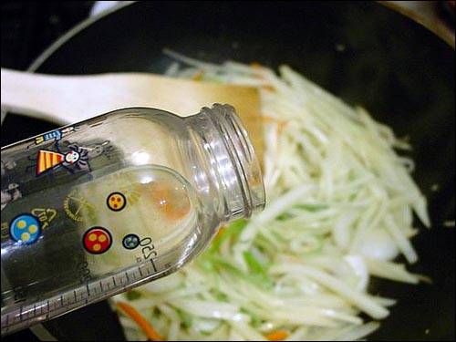 계량컵을 따로 구입하는 대신 아기가 쓰던 낡은 젖병을 두고 이럴 때 사용하면 요긴하지요. 기름만 넣고 볶다보면 감자볶음이 너무 퍽퍽해질 수 있습니다. 그렇다고 기름을 더 넣자니 느끼하구요. 그럴 때에는 군만두를 만들 때처럼 이렇게 한창 익어가는 감자에다가 물을 4-5큰술(약 60CC) 넣어주면 더 부드럽게 잘 익습니다.