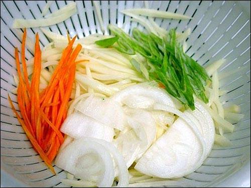 감자 1알(얇게 채 썰어), 채 썬 양파 2큰술, 채 썬 당근 1큰술, 채 썬 대파 1큰술, 다진 마늘 1/2큰술, 올리브유나 식용유 2큰술, 소금 1-2작은술, 참기름 1작은술, 물 4-5큰술, 통깨 약간