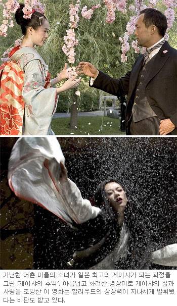 1930년대 일본 교토를 배경으로 한 이 영화는 두가지 면에서 관객의 예상을 배반한다. 첫째는 배경이 버젓이 일본인데 대사는 영어다. 자막을 극도로 싫어하는 미국인을 위한 배려다. 또 하나는 게이샤 역을 연기한 여배우들이 장쯔이,궁리,양쯔충 등 중국의 대표 여배우라는 것. 이쯤되면 할리우드가 중국배우를 내세워 게이샤를 추억한 상업성을 알 만하다.