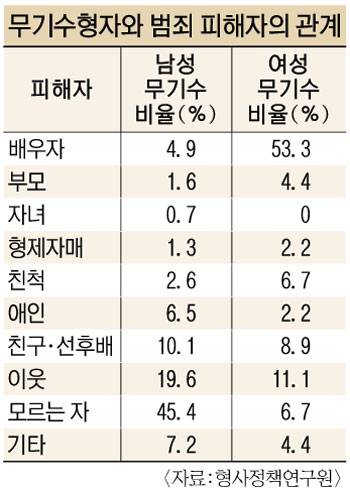 여성무기수 절반 이상의 죄목은 남편 살해죄였으며 30∼40대가 약 70%에 달했다. 특히 남편을 살해한 행위가 부인을 살해한 때보다 훨씬 가혹한 처벌을 받아 형평성에 문제가 있는 것으로 나타났다. 이 같은 사실은 한인섭 서울대 법대 교수가 '형사정책연구 2005년 가을호'에 기고한 '여성무기수형자에 대한 형사절차 및 시설내 처우'라는 논문에서 밝혀졌다.