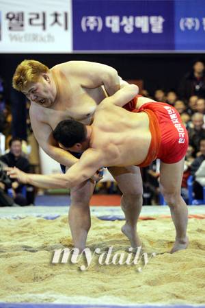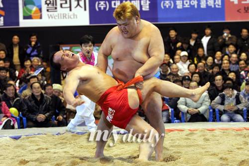 ['람바다' 박광덕이 홍팀 장인환선수를 들배지기를 이용하여 넘어뜨리고 있다. 사진=곽경훈 기자]