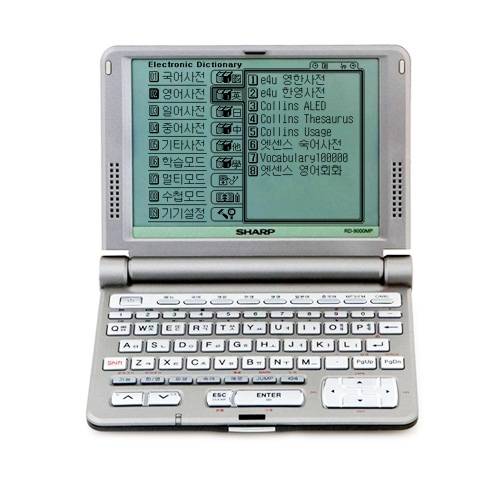 5인치 크기의 흑백 액정을 탑재한 샤프전자 RD-9000MP. 318×240 화소의 저반사 액정을 사용해 가독성을 높였다. 특히 41권에 이르는 방대한 분량의 사전과 콘텐츠를 수록한 것이 돋보이는 전자사전이다. |