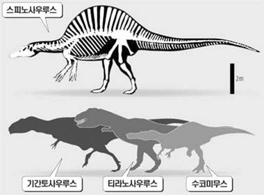 ◇가장 큰 공룡은 누구=최근 이탈리아 밀라노의 자연사박물관은 스피노사우루스의 화석을 분석한 결과 코 끝에서 꼬리까지의 전체 몸 길이가 17m에 달한다는 결론을 얻었다. 이 공룡의 두개골 길이는 1.75m, 몸무게는 7~9t가량으로 추정된다. 이번 분석에는 개인 화석 수집가로부터 입수한 99㎝ 길이의 스피노사우루스 주둥이부분 화석과 시카고대학에 있던 두개골 후두부 화석이 사용됐다.