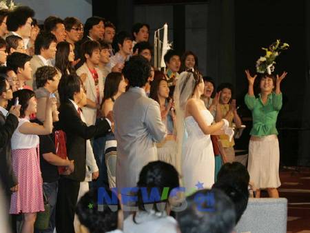 [사진설명=지난해 7월3일 서울 광장동 쉐라톤 그랜드 워커힐 호텔 비스타홀에서 열린 박준형-김지혜 결혼식에서 부케를 받은 조향기(오늘쪽)와 정준하(왼쪽)]