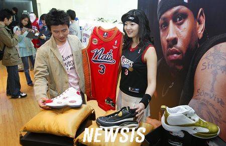 26일 리복 센트럴시티 매장에서 한국리복은 신인시절부터 리복과 함께해온 세계적인 미국프로농구(NBA) 스타 앨런 아이버슨(Allen Lverson)의 데뷔 10주년을 기념해 '앨런 아이버슨 10주년사 미니 박물관'을 개최, 행사장을 찾은 고객들이 앨런 아이버슨의 농구화 등을 살펴보고 있다. /서경리기자 sougr@newsis.com