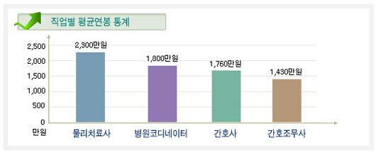 조사 결과에 따르면 직업별 평균연봉은 물리치료사 2,300만원, 병원코디네이터1,800만원, 간호사 1,760만원, 간호조무사 1,430만원 순으로 나타났으며 그 중 최고연봉을 받는 사람은 3,600만원을 받는 물리치료사였으며 최저연봉은 간호조무사 770만원인 것으로 나타났다.