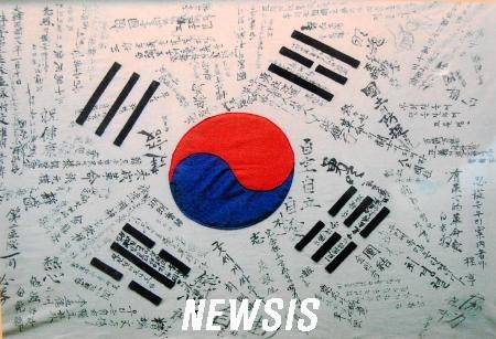 사진은 1942년 일제시대 말기 의병들이 서명한 태극기. '自主自立', '自由' 등의 글자들이 선명하게 쓰여있다. /권주훈기자 joo2821@newsis.com