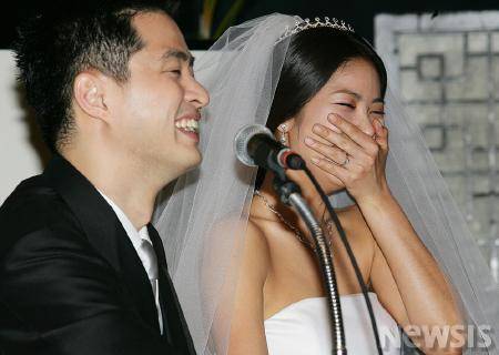 14일 오후 한남동 하얏트에서 열린 지누-김준희 결혼식 전 열린 기자회견에서 김진우(지누)와 김준희가 환하게 웃고 있다. /김종현기자 kim-jh@newsis.com