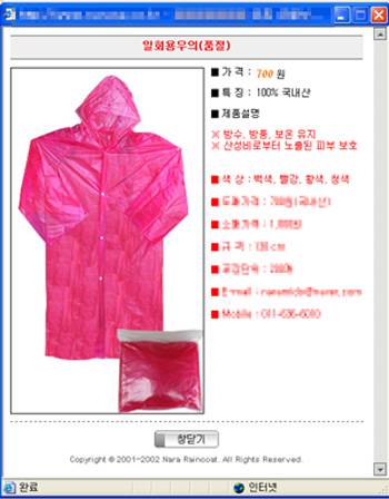 [개그콘서트에 출연했던 우비삼남매.(위) 온라인 쇼핑몰에서 품절된 붉은 우비.(아래). 사진 = KBS, 나라우의 홈페이지 화면 캡처]