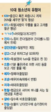 학부모 백모(44·여)씨는 최근 중학교 1,3학년 아들의 인터넷 채팅을 보고는 깜짝 놀랐다. 'ㄱㄱㅁ?' 'OTL' 'ㅅㅂㄹㅁ' 등 도무지 의미를 알 수 없는 자음과 글자들을 주고 받으며 대화하고 있었기 때문이다. 'ㄱㄱㅁ'은 '개그맨'이라는 단어의 자음만 사용한 것으로 청소년들 사이에서는 '어이 없다'는 뜻으로 통용된다. 'OTL'은 '좌절'이라는 의미다. O가 머리를,T는 팔을,L은 꿇은 다리를 의미한다.'ㅅㅂㄹㅁ' 역시 비속어를 자음만 사용한 것이다.