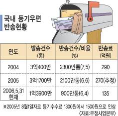 ◇실태와 원인=지난해 발송된 국내등기우편은 3억1700만통이고 이 가운데 6.6%인 2100만통이 되돌아왔다. 2004년에는 3억400만통중 2300만통(7.5%)이 반송됐다. 발송자가 부담한 반송료만 해도 2004년 290억원,지난해에는 270여억원이었다. 등기우편이 전달되지 못해 수백억원의 반송료만 허공으로 사라진 셈이다.