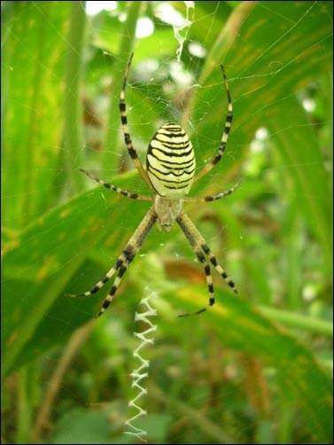 신속하게 거미줄을 잠시 버리고 제일 안전하다고 생각되는 거미줄 꼭지점까지 올라갑니다. 그러고서는 시치미 뚝 떼고 납짝 엎드려 숨어 풀을 뜯어먹는 초식 곤충인 체 합니다. 하지만 거미는 곤충이 아닌 절지동물과에 속하는 동물이지요.