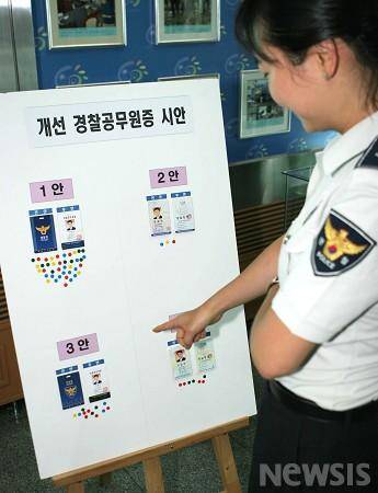 22일 강원지방경찰청 1층 현관에 마련된 '개선 경찰공무원증 시안' 앞에서 한 여경이 가장 마음에 드는 시안을 가리키고 있다.