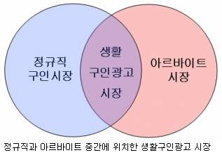 생활구인광고 시장은 정규직 구인 시장과 아르바이트 시장의 중간 형태를 띠고 있다. 채용 인력의 대부분이 비정규직이지만, 아르바이트와 달리 단기성을 지니지는 않기 때문.