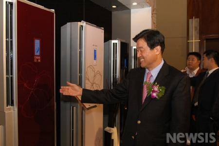 사진은 중국시장에 첫 출시하는 LG 에어컨 투윈원을 우남균 사장이 소개하고 있다.