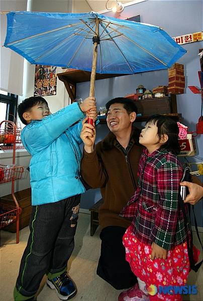 14일 오후 광주 금호생명빌딩 어린이박물관 특별전시장에서 아버지가 아이들에게 전시된 옛날 비닐우산을 보여 주며 즐거운 시간을 갖고 있다. /최금복기자 nagumbok@newsis.com