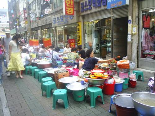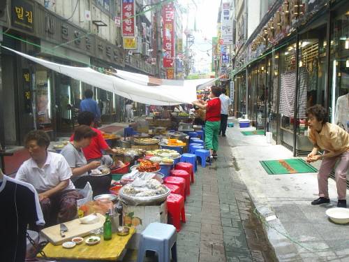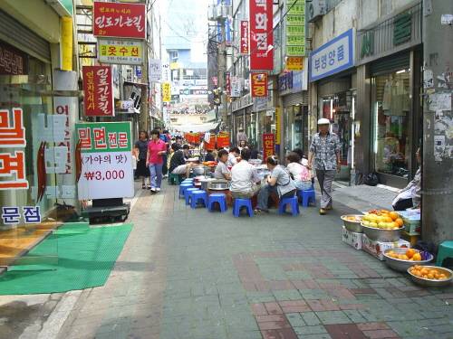 PIFF광장을 지나 큰 길을 가로 지르면 이 먹자골목이 바로 나타난다. 좁은 골목의 한 가운데로 줄지어 늘어선 노점들에는 선남선녀들이 작은 의자에 둘러 앉아 있는 모습이 자주 눈에 뜨인다. 그들 앞에는 충무김밥과 순대, 당면들이 가득 쌓여 있고, 넉넉한 품새를 지닌 할머니들이 연신 웃음을 터트린다. 그 넉넉한 여유가 보기 좋아, 한쪽 모서리에 위치한 선한 얼굴의 할머니 앞에 슬그머니 자리를 잡았다.