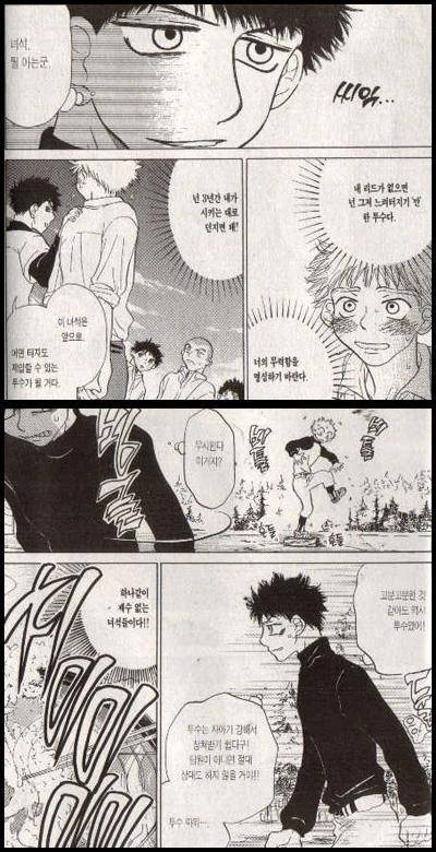 이노우에 다케히코의 <슬램덩크>나 우라사와 나오키의 <해피>, 아다치 미츠루의 <터치>처럼 작품성에서 대작 스포츠소재 만화라는 작품들은 대개 저 구도를 크게 벗어나지 않습니다. 물론 우라사와 나오키의 <야와라>나 카이타니 시노부의 <원 아웃>처럼 이미 완성된 기량을 지닌 주인공이 등장하는 경우도 있지만 이미 정상급의 기량같아 보이지만 주인공들은 갖은 역경을 맞으면서 자신의 기량을 더욱 업그레이드 시키니 공식을 크게 배반하지는 않는다고 보아야겠죠.
