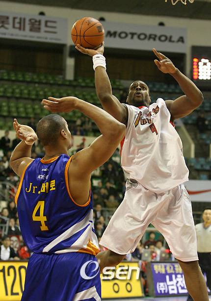 2006~2007 현대모비스 프로농구 서울 SK와 안양 KT&G의 경기가 14일 잠실학생체육관에서 열렸다. SK의 키부 스튜어트가 KT&G 주니어 버로를 앞에 두고 원핸드슛을 던지고 있다./잠실학생체=김영민 기자ajyoung@osen.co.kr