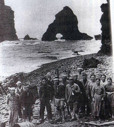 | ◇일제강점기에 수산물 채취 등 강제노역에 동원된 제주도 해녀 등 조선인 징용자들이 독도 해변에서 우울한 표정으로 기념사진을 찍고 있다. 부산외대 김문길 교수 제공 |