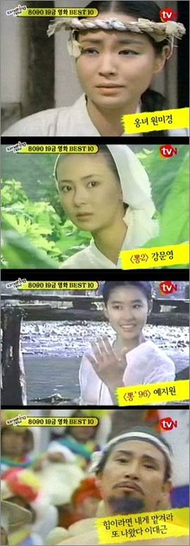 이날 성인들이 추억하는 최고의 에로물에 선정된 영화는 '변강쇠'였다. 성(性)을 주제로 해학과 익살을 절묘하게 버무려 남성들의 성적 판타지를 충족시켰던 영화. 파워맨 이대근과 '옹녀'로 분한 배우 원미경의 앳된 얼굴이 눈길을 끈 가운데, 사극전문배우 김진태와 하유미의 젊은 시절 모습이 공개돼 출연자들의 탄성을 자아냈다.