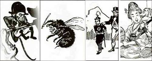 "곤충이나 원숭이, 혹은 싸움닭으로 표현되는 경우가 많다. 그리고 체구가 작은 소년 병사나 왜소한 군인으로 표현된다. 혹은 기모노를 입고 교묘한 웃음을 흘리는 여인의 모습으로도 표현되기도 하는데 일본의 이와 같은 전체적인 이미지를 바탕으로 러일 전쟁의 흐름에 따라 모습과 표정이 다르게 표현되는 것이 전체적인 특징이다."