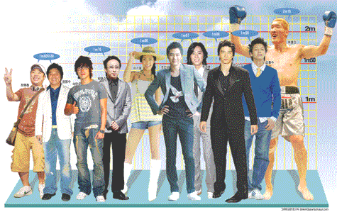 최장신 연예인은 1m90인 탤런트 김흥수. 이기우와 여욱환이 1m89, 차승원과 데니스오가 1m88으로 뒤를 이으며 1m87의 조인성 주지훈 유지태 조연우 구본승 김태우 등도 키가 큰 축에 속한다.