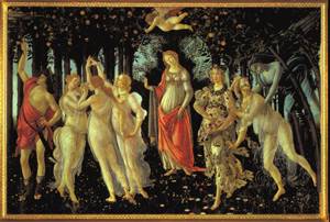 무대는 신화 속에 전해지는 '봄의 정원'으로 황금사과가 열린다는 곳이다. 아름다운 숲 속에는 아홉 명의 인물이 등장하는데, 주인공은 단연 비너스로 미의 여신답게 우아하고 사랑스러운 자태를 마음껏 발산하고 있다. 봄의 중심인 5월은 새 신부의 계절이니, 사랑의 신이자 예비신부의 표상인 비너스가 '봄의 정원'에는 있는 것은 당연한 일일 터.