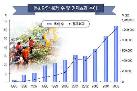 정부 지정축제인 문화관광축제만 놓고 보더라도 1995년 2개 축제에 30만 명이던 방문객이 2005년 45개 축제에 3200만 명으로 증가, 10년 새 방문객 수가 100배 이상 늘었다. 2004년부터 지속적으로 확대시행 중인 주5일 근무제가 주말 나들이 인구를 지역축제로 유입시키는 데 일조했음은 물론이다.