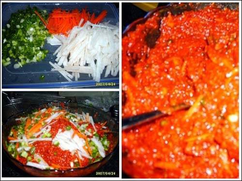 큰딸 소연이 유치원에 데려다 주고 나니 한가해졌습니다. 그래서 얼른 김치 양념을 만들기 시작했습니다. 파도 다듬고 당근과 무는 채 썰고요. 생강이랑 마늘도 까놓고 양파 조금이랑 시원하게 먹으려고 배도 한 개 깎았습니다.