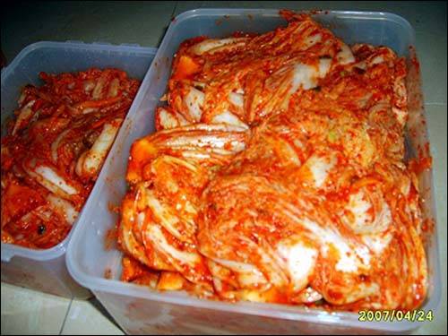 혼자 앉아 이 생각 저 생각 하면서 버무리다 보니 금세 7포기의 김치가 빨간 옷을 입고 김치통에 담아졌습니다. 큰 통 한 개와 작은 통 한 개에 김치가 꽉 들어찼습니다. 뭔 큰살림이라도 준비한 마냥 왜 그리 흐뭇하던지요. 타국에 살게 되면서부터 이상하게 김치만 담그면 부자가 부럽지 않고 김치 한 가지만 있어도 다른 반찬이 아쉽지 않습니다.