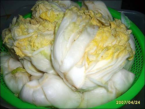 이곳 광동의 습한 기운을 먹고 자란 배추라 그런지 꽤 오래 소금물에 담갔는데도 여전히 쌩쌩했습니다. 저녁때 담그려고 했는데 제대로 절여지지 않아 '조금 있다 건져놓고 자야지'라고 생각하며 기다리다 그만 잠이 들었습니다.