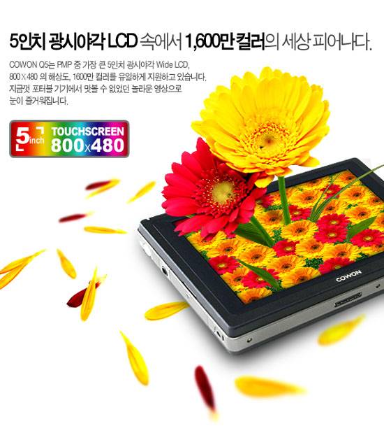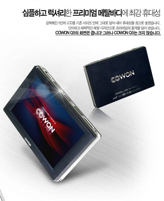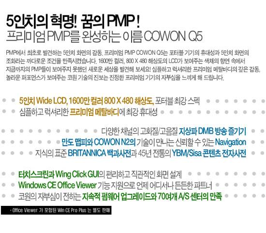 이번에 출시되는 프리미엄 PMP 'COWON Q5'는 국내 최초로 5인치의 초고화질 와이드 LCD를 채택하고 있는데 동영상, 음악 재생은 물론, 만도 맵피(Mappy) MXG를 내장한 내비게이션, 지상파 DMB, 외장 무선랜 지원 기능까지 구현되는 차세대 컨버전스 PMP이다.
