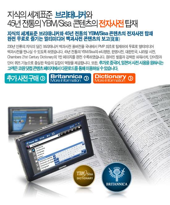 PMP업계 최초로 지식의 세계표준으로 일컫는 브리태니커 백과사전을 탑재하여 누구나 쉽게 유용한 지식정보를 열람할 수 있으며, YMB 시사의 '이포유(e4u) 영한사전'과 한영사전, '체임버스 21세기 영영사전(Chambers 21st Century Dictionary)' 및 '대한민국 나라말 사전'이 망라된 전자사전 기능도 포함되어 있다. 또한 메가스터디를 비롯한 다양한 교육사이트와 멜론, 도시락 등의 음악사이트 지원을 통해 다양한 교육 및 엔터테인먼트 콘텐츠를 활용할 수 있다.