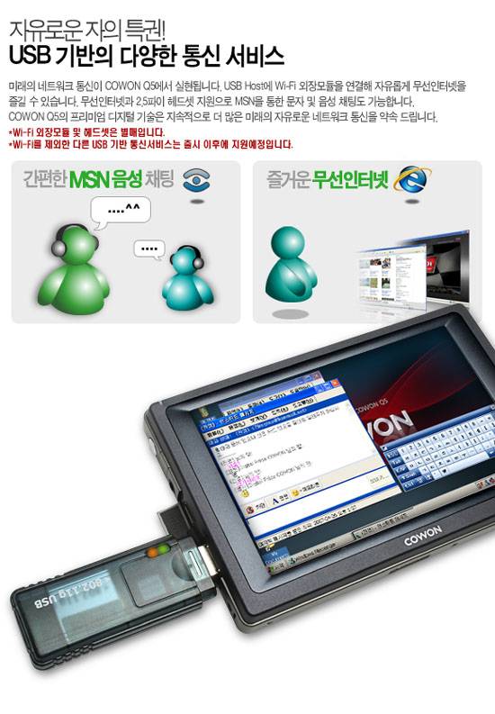 'COWON Q5'는 향후 USB 기반의 다양한 통신서비스도 지원될 예정이어서 명실공히 프리미엄 PMP로서 시장을 선도하는 제품이 될 것으로 기대되고 있다