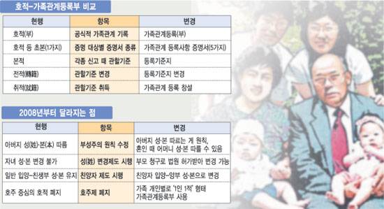 호주제 폐지에 따라 이를 전제로 한 입적·복적·일가창립 및 분가 제도가 폐지된다. 특히 부성주의(父姓主義) 원칙이 수정돼 자녀가 어머니의 성과 본을 따를 수 있게 되며 친양자 제도가 도입된다.