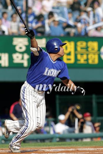 [특유의 만세타법으로 2000안타를 기록하는 삼성 양준혁. 사진〓곽경훈 기자 kphoto@mydaily.co.kr]