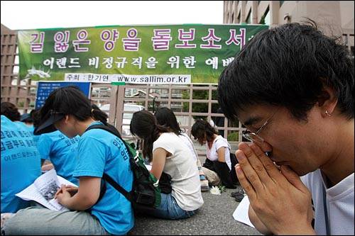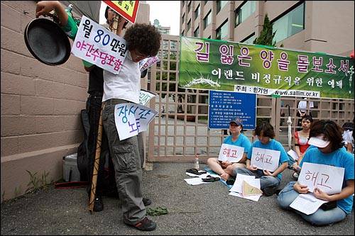 | ▲ 이랜드 계열사 노동자들이 비정규직 문제 해결을 촉구하며 점거농성과 집회를 열고 있는 가운데, 한국기독청년학생연합회 회원과 홈에버 월드컵몰 비정규직 노동자들은 10일 오전 서울 마포구 창전동 이랜드 본사앞에서 이랜드 비정규직을 위한 예배를 열었다. |