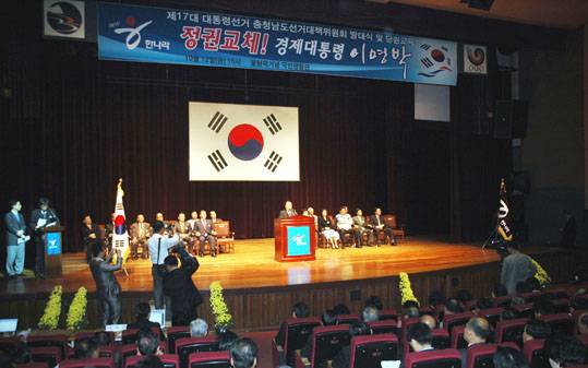 이 위원장은 "이번 기회에 충청의 맹주라 자처하며 충청을 기만하는 세력이나 죄를 덮기 위해 당명을 세탁하는 이들에게 어느 당과 인물이 진정으로 충청을 위하는지 확실히 보여주자"며 "국민들의 지지를 받고 있는 이명박 후보와 한나라당에 자부심을 가지고 일당백의 전사가 돼 당당히 대통령 만들기에 나서자"고 역설했다.