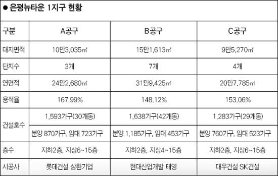1지구는 ABC 3개 공구로 나뉘는데 A공구는 롯데건설과 삼환이 짓는다. 중심상업지역과 구파발역이 가까운 게 장점. 인근에 중ㆍ고등학교는 개교 예정이나 초등학교가 배정돼 있지 않다.