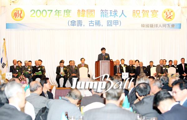 11월12일 올림픽 파크텔 올림피아홀에서 열린 2007년 한국농구인 축하연에서 대한농구협회 이종걸 회장이 축하의 말을 전하고 있다. 산수, 고희, 회갑을 맞은 농구인 33명을 대상으로 축하연이 열린 이날 행사에서 이종걸 회장은 "한국농구인 축하연이 좋은 풍습이자 잔치가 되고 있어 매우 기쁘다"며 "오랫동안 건강하셨으면 좋겠다"고 바람을 전했고, 더불어 11월26일 농구대잔치 개막과 발맞춰 열릴 100주년 기념행사에대한 호응도 부탁했다. 이날 행사에서는 산수, 고희, 회갑을 맞은 농구인 33명을 대상으로 축하연이 열렸고, 대한농구협회 이종걸 회장, KBL 김영수 총재, WKBL 김원길 총재를 비롯해 김인건, 하의건, 조승언, 이우재, 정광석, 정봉섭, 이인표 씨 등이 참석해 오랫동안 한국 농구 발전에 공헌해왔던 이들 33명을 축하했다.