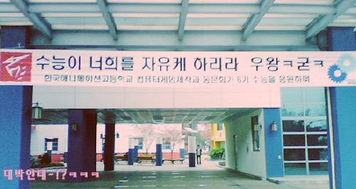 한국애니메이션고등학교 컴퓨터게임제작과 동문회에서 수능을 치루는 학교 후배들을 위해 제작한 이 현수막을 본 누리꾼 반응이 가히 폭발적입니다.
