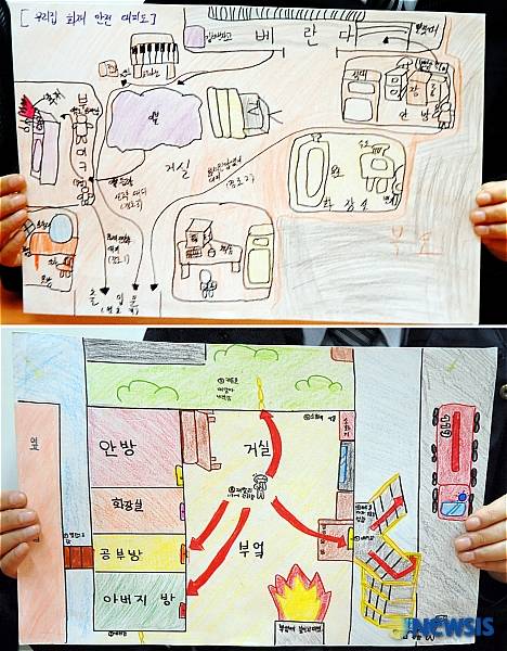 오늘 심사에서 대상을 받은 곽지은 어린이는 집에서 화재가 발생했을때 화재상황에 따라 3가지 방법으로 대피하는 경로를 작성했으며(사진 위), 우수상을 받은 어린이는 화재가 발생한 집안에서 소화기를 이용하거나 옆집으로 대피하는 등 화재시 행동요령을 상세히 묘사해(사진 아래) 선정 됐다고 밝혔다. (사진=서대문소방서 제공)/서경리기자 sougr@newsis.com