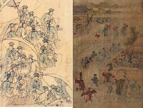 | ◇문과 응시생이 거쳐야 했던 소과 시험장의 모습. 마치 관광하듯 자유롭게 시험을 치르는 모습이 이채롭다.(왼쪽)◇단원 김홍도가 그린 '모당평생도' 중 과거에 합격한 뒤 머리에 어사화를 꽂고 사흘 동안 친척과 선배 급제자, 시험관 등을 방문하는 모습을 묘사한 장면. |