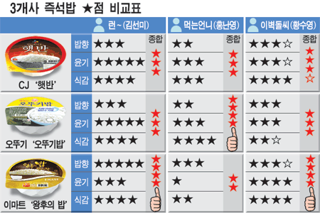 블로고스피어(blogosphere, 블로그 세계)에서 프로 못지 않은 전문성과 예리한 품평기로 인정받고 있는 3인의 식도락 부문 파워블로거들에게 깐깐한 감정을 의뢰했다. ▶밥향 ▶윤기 ▶식감 ▶종합 4가지 항목으로 세분화해 별점(5개 만점)을 매겼으며, '라면에 말아먹기' '데우지 않고 먹어보기' 등 다양한 실험을 통해 최고의 즉석밥을 선정했다. 밥 고유의 향에서는 '왕후의밥'이 가장 좋은 평가를 받았으며, '윤기'와 '식감'에서는 '햇반'이 좋은 평가를 받았다. 종합평가에서는 3명 중 2명이 '왕후의밥'에, 1명이 '오뚜기밥'에 최고점을 줬다. 전체적으로 고른 평점을 받은 '햇반'은 3명 모두 2위로 꼽아 '무난하다'는 평가를 받았지만, '즉석밥=햇반'으로 통할 만큼 압도적인 브랜드 파워에 비해서는 다소 미진한 결과로 아쉬움을 남겼다.