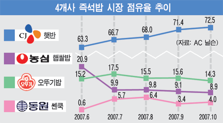 특히 올해 즉석밥 시장은 그 어느 때보다 뜨거웠다. 2002년 농심 '따끈따끈 햅쌀밥', 2004년 오뚜기 '오뚜기밥'에 이어 올해 6월 동원F&B '쎈쿡'이 시장에 가세하면서 경쟁은 더욱 심화됐고, 지난 10월 이마트가 자체 PB(Private Brand) 상품으로 '왕후의 밥, 걸인의 찬'을 내놓은 직후 시장은 전에 없이 달아올랐다. 이마트가 공격적인 마케팅을 추진하면서 '왕후의밥, 햇반 눌렀다'류의 기사가 봇물처럼 쏟아졌는가 하면, 11월 말엔 반격이라도 하듯 '햇반 아성, 끄떡 없다'는 논조의 기사가 쏟아졌다. 시장조사기관 AC닐슨 자료에 따르면, 지난 10월 기준 즉석밥 시장 점유율은 CJ '햇반' 72.5%, 오뚜기 '오뚜기밥' 14.3%, 농심 '햅쌀밥' 8.9%, 동원 '쎈쿡' 4.0%를 기록했다.(그래픽 참조)