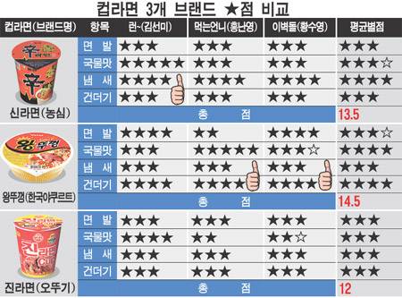 스포츠조선 '파워 브랜드' 맛감정단의 손에 오른 컵라면 브랜드는 라면 업계 부동의 1위업체 농심의 컵 '신라면', 그 아성을 쫓고 있는 한국야쿠르트의 '팔도 왕뚜껑'(이하 왕뚜껑), 오뚜기 컵라면 '진라면' 등 3개다.